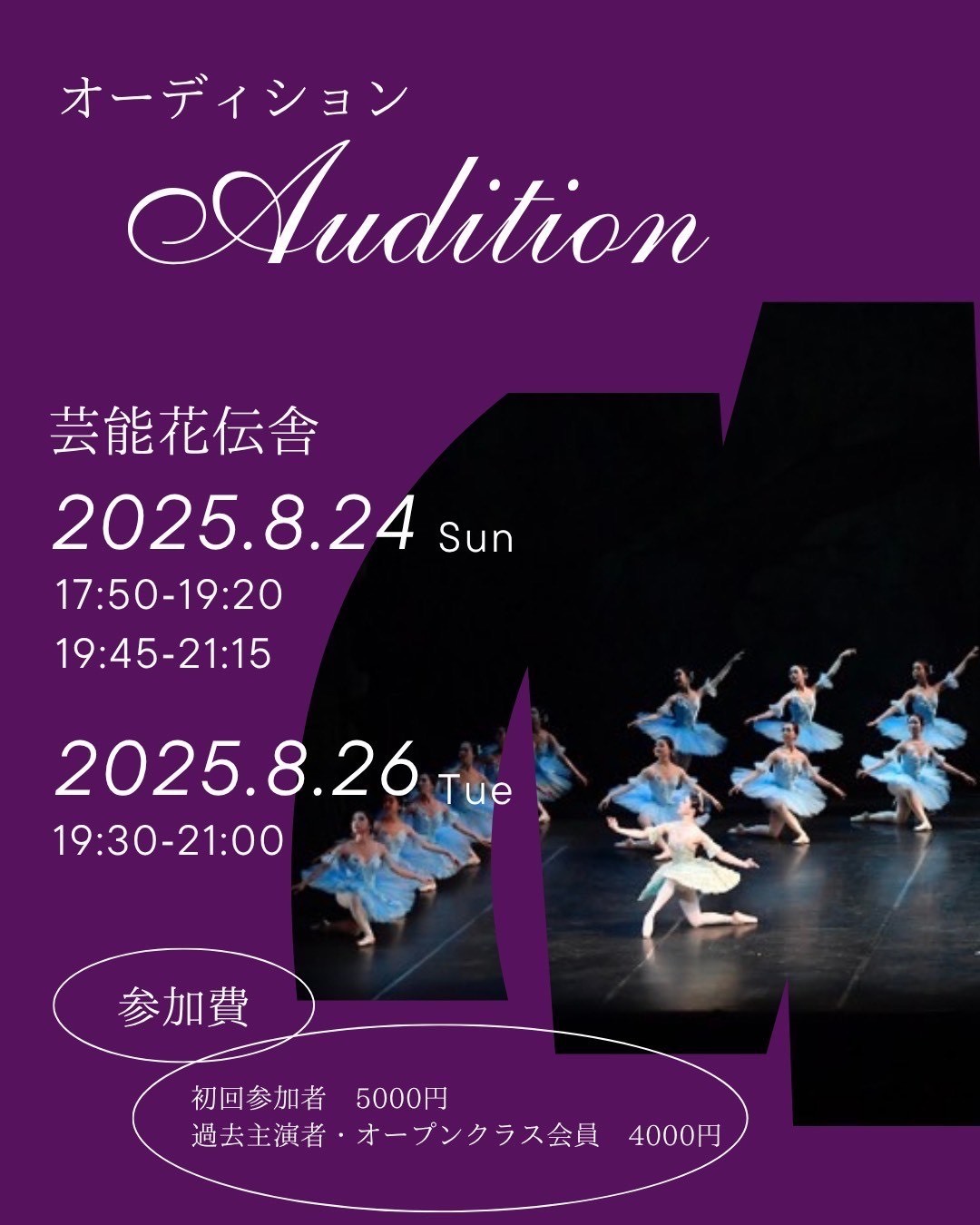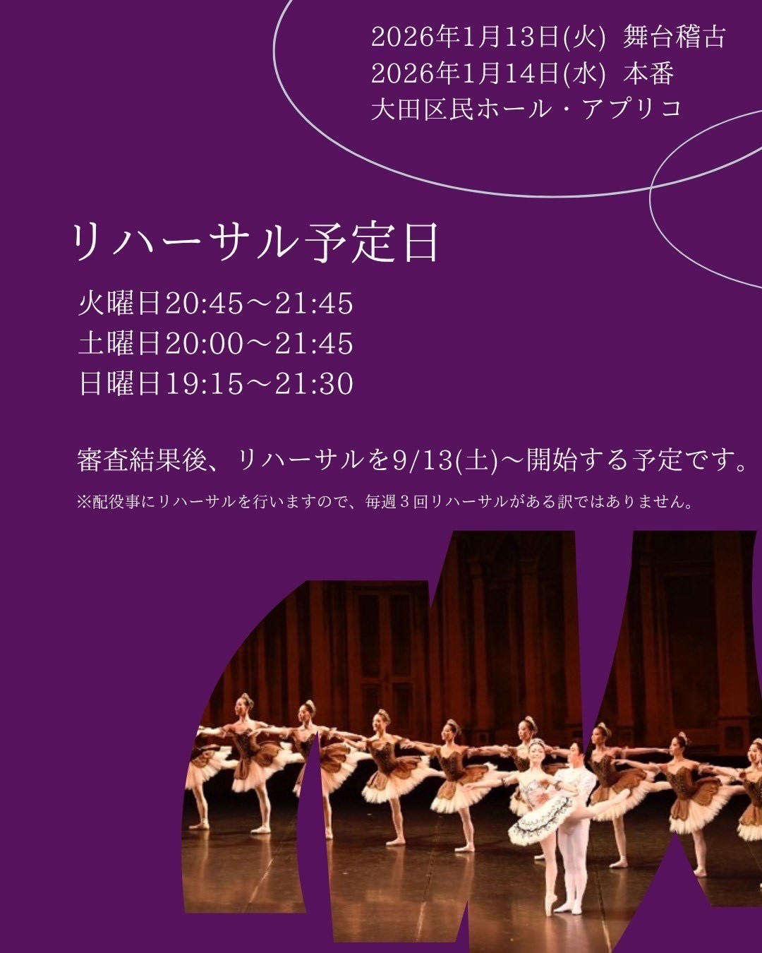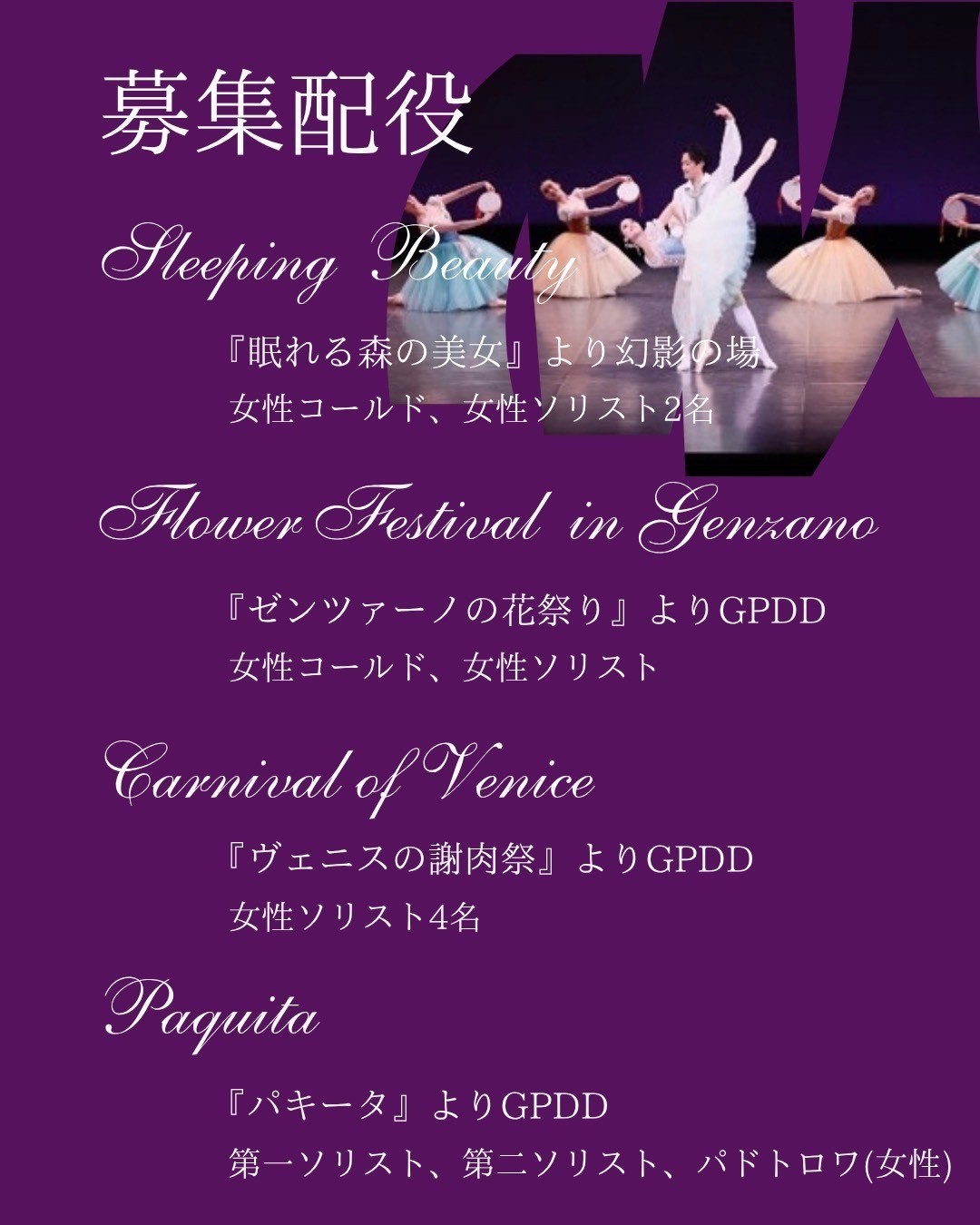 ※オーディションの中でヴァリエーションを踊っていただく場合もあります(振りはその場で出します。仕上がっている必要はありません)。